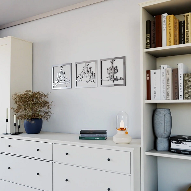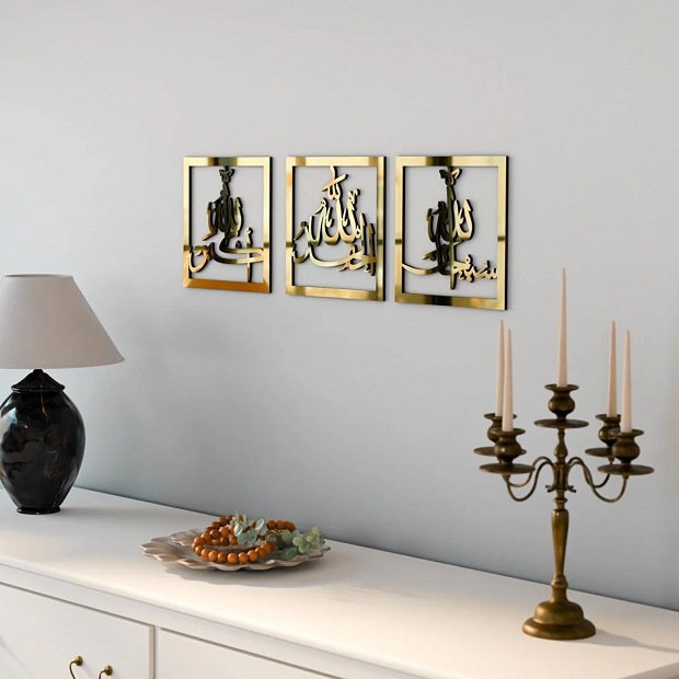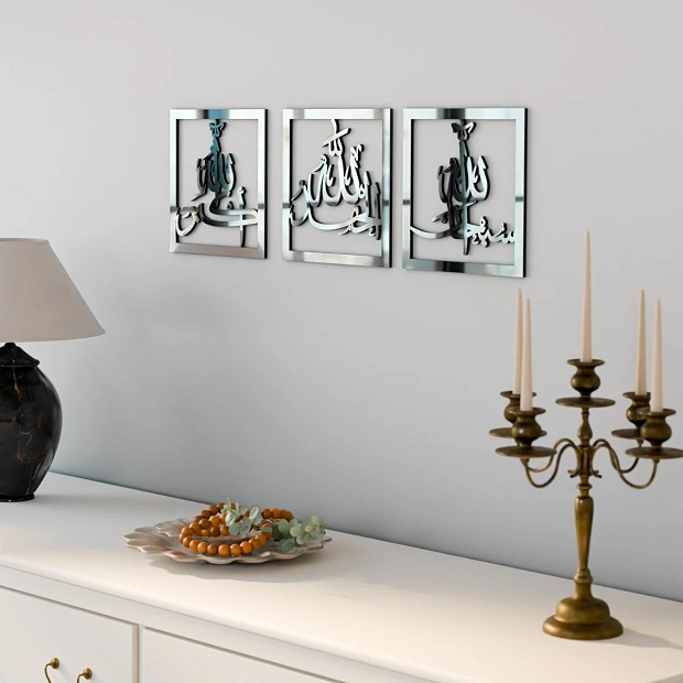 Apportez une atmosphère spirituelle et élégante à votre intérieur avec ce superbe tableau islamique métallique regroupant les invocations “Subhana Allah, Alhamdulillah, Allahu Akbar”. Réalisé avec une calligraphie arabe artistique, ce décor mural incarne à la fois foi, sérénité et modernité.